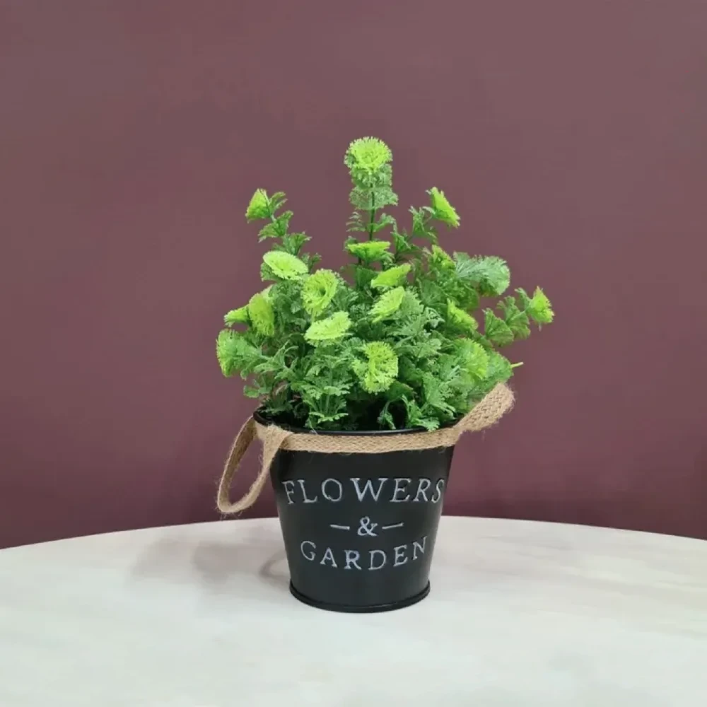 Оваа вештачка ќитка е дизајнирана со димензии 30 x 15 cm, што ја прави идеална за поставување на полици, маси, прозорци или тераси. Нејзината црна метална саксија додава модерен индустриски изглед, а натписот “Flowers & Garden” внесува рустичен шарм.