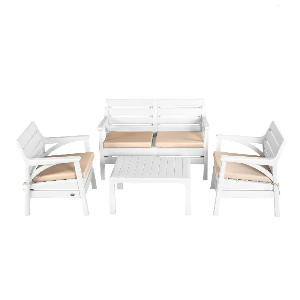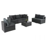Овој комплет вклучува два аголни делови, четири фотелји и масичка со сигурносно стакло. Сите елементи се независни, што овозможува флексибилно поставување. Можете лесно да промените изгледот на просторот според настанот или расположението. Благодарение на лесната конструкција, преместувањето не претставува проблем. Оваа гарнитура е подеднакво практична и визуелно привлечна.