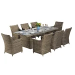 За дополнителна удобност, сетот вклучува 8 столици со ергономски дизајнирани потпирачи и дебели перничиња. Овие перничиња обезбедуваат оптимална поддршка, додека нивниот водоотпорен материјал овозможува лесно одржување.