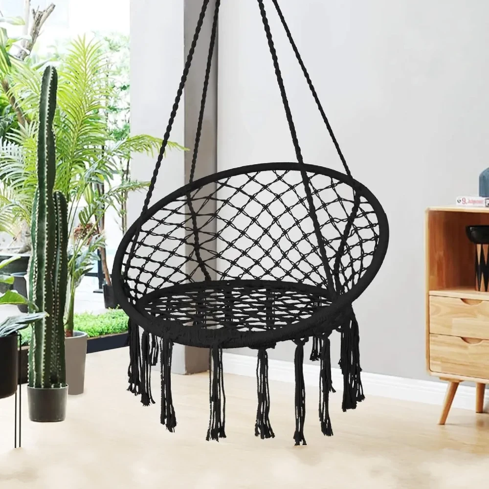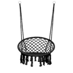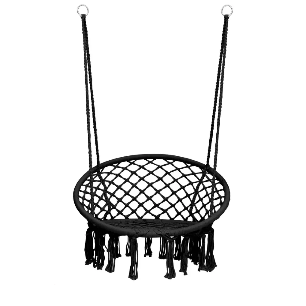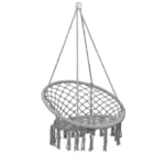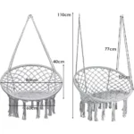 Оваа лулашка претставува стол за хамак изработен од памучни јажиња и челична конструкција, што обезбедува одлична рамнотежа помеѓу удобност и стабилност. Кружната форма на седиштето и мрежестата плетка овозможуваат телото природно да се прилагоди при седење, без чувство на вкочанетост. Декоративните реси на долниот дел ѝ даваат автентичен и топол изглед, особено погоден за двор или тераса.