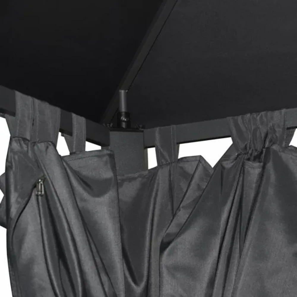 Со четири странични завеси, оваа тенда овозможува целосна заштита од сонце, ветар и дожд. Завесите се изработени од висококвалитетен полиестер, кој е отпорен на влага и UV зраци. Овој материјал е лесен за одржување, што овозможува едноставно чистење и долготрајна свежина на бојата. Завесите може да се отворат и затворат според потребите, што ви дава максимална флексибилност и удобност.