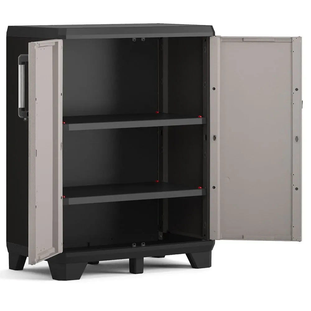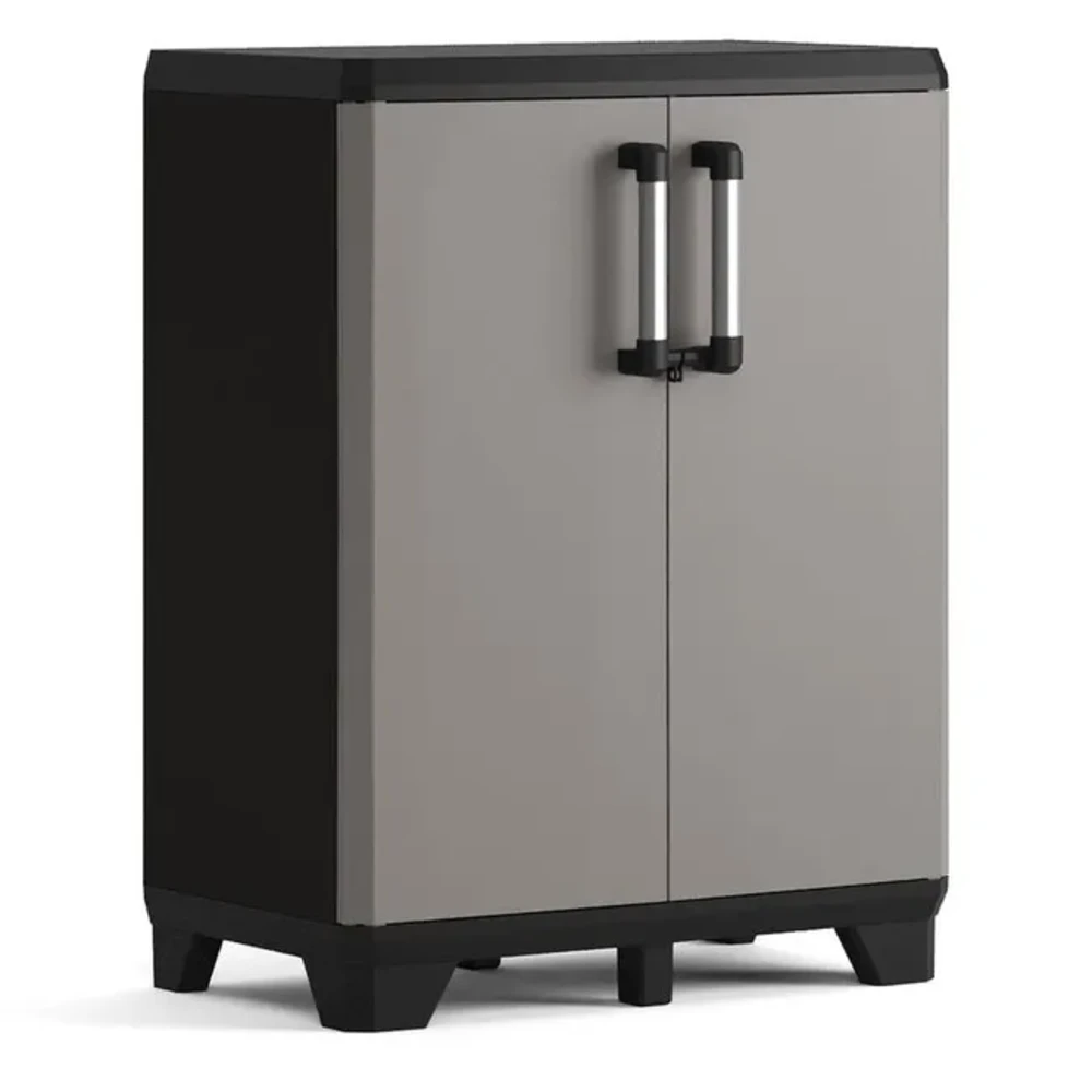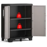 Пластичната комода Keter е дизајнирана со четири аголни пластични ногарки и две централни ногарки, што обезбедува зголемена стабилност и рамномерна распределба на тежината. Вратите можат да се заклучуваат со катанец (катанецот не е вклучен), што ја прави идеална и за складирање на посензитивни предмети.