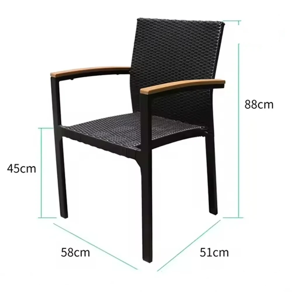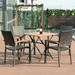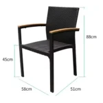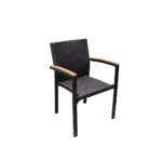 Столот Флора се издвојува по својот уникатен спој на ратан, алуминиум и дрво, што резултира со стабилен, издржлив и визуелно привлечен производ. Алуминиумската рамка обезбедува цврстина и долг работен век, додека еколошкиот PE ратан е отпорен на надворешни влијанија и лесен за одржување. Потпирачите за раце изработени од дрво од еукалиптус додаваат природен изглед и дополнителна удобност.